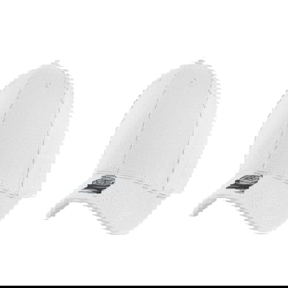 6 Panel Cap mit Frontfütterung. Medium profile. Schwarzer, softer Kunststoff-Schnappverschluss. Hergestellt aus 98% recyceltem Polyester und 2% Spandex.