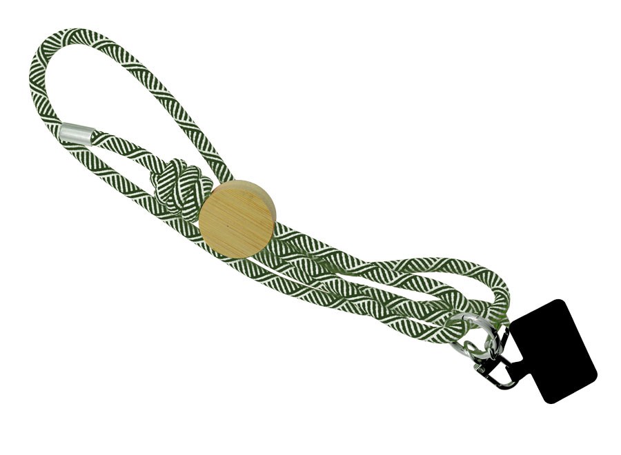 Lanyard aus RPET mit einer Länge von 160 cm und einer Dicke von 8 mm. Universelles und abnehmbares Pad aus Polyester zur Befestigung von Handys mittels ihrer Hülle. Ring und Enden der Schnüre aus rostfreiem Edelstahl. Inklusive Bambus-Schnalle.