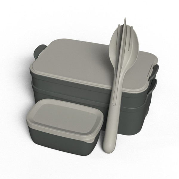 STAKK BENTOBOX READY passt einfach perfekt zu einem gesunden Lebensstil, denn sie bietet viel Platz für Brote, Salate und kleine Gerichte. Die Bentobox besteht aus zwei unterschiedlich großen Schalen mit Deckel und einem Besteckset. Durch den modularen Aufbau lässt sich das Mittagessen optimal trennen und alles bleibt bis zur Pause appetitlich frisch. Die Schalen können natürlich auch einzeln verwendet werden. Sie sind mikrowellengeeignet, ideal zum Aufwärmen der Mahlzeiten im Büro. Das kompakte Besteckset KLIKK ist die ideale Ergänzung, denn so kann man sein Mittagessen überall genießen. - Der nachhaltige Markenartikel – made in Germany. Für unsere Kollektion verwenden wir vorwiegend biozirkuläre Kunststoffe, die aus gebrauchten Speiseölen recycelt werden.