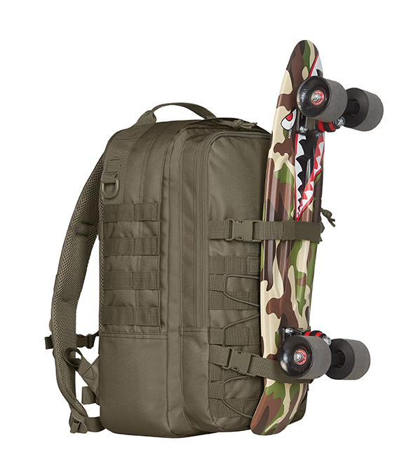 funktionaler Rucksack mit 3-seitigem Molle-Bandsystem und Klett-Besatz; elastischer Kordelbesatz; großes Hauptfach mit verdecktem 2-Wege-Reißverschluss; gepolstertes Notebook-Fach mit Klettlasche; Auslass für Kabel oder Trinkschlauch; großes Reißverschluss-Netzfach; Reißverschluss-Vortasche mit 2-Wege-Reißverschluss und Organizer-Fächern; seitliche Kompressionsgurte mit Steckschnallen, auch vorne und rückseitig schließbar z.B. für Befestigung am Trolley-Gestänge; rechts und linksseitig D-Ringe; gepolstertes Rückentragesystem mit höhenverstellbarer Brustgurt; D-Ringe und Bandlaschen auf den Trägern; abnehmbarer, längenverstellbarer Hüftgurt; Handgriff