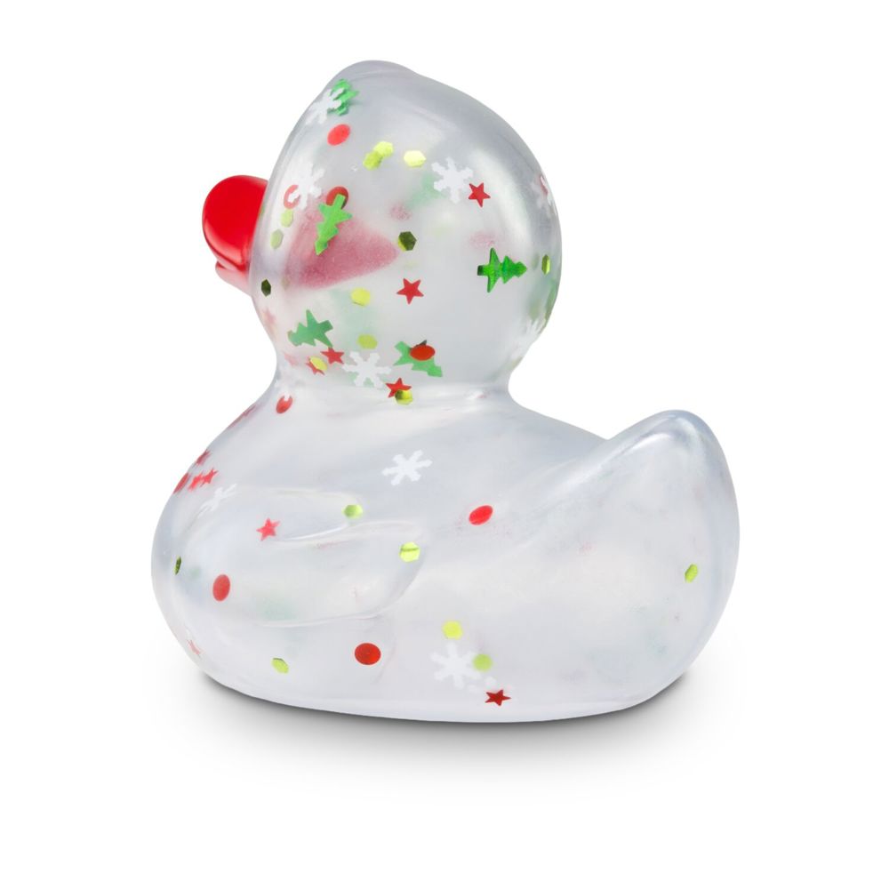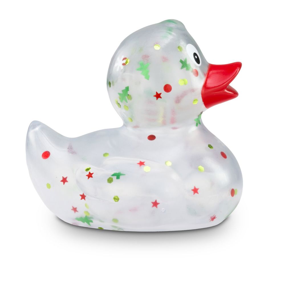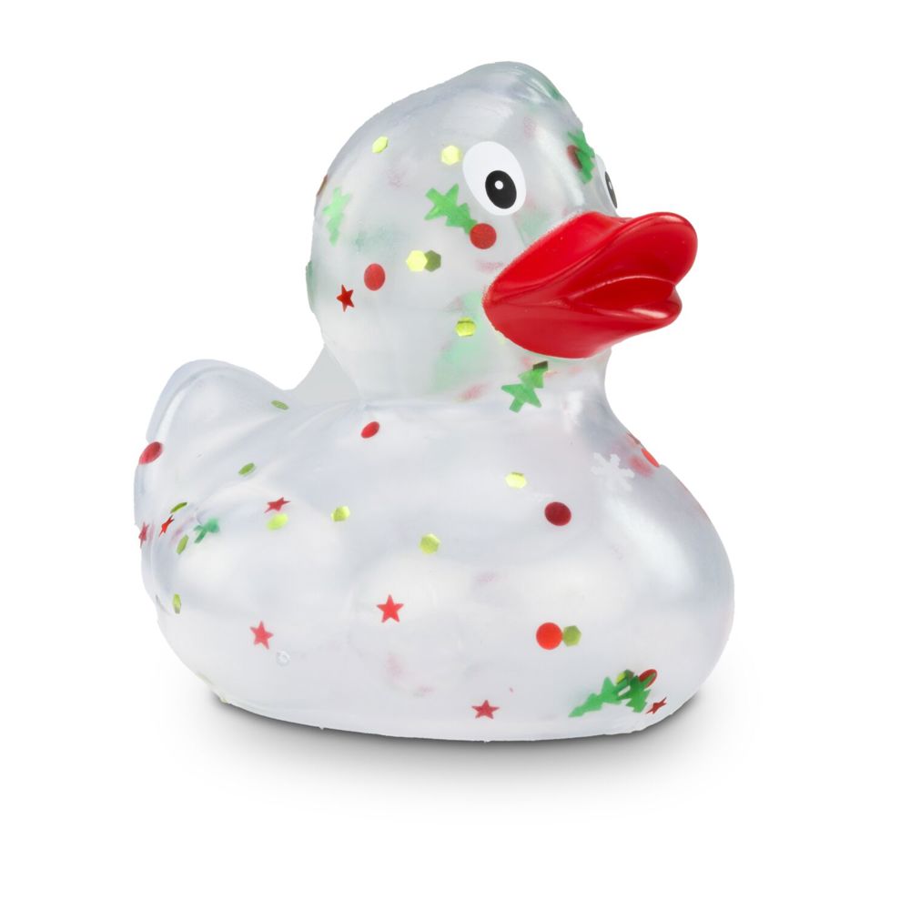 Leni Lametta erstrahlt in weihnachtlichem Glanz. Sie trägt auf ihrem durchsichtigen Gefieder roten und grünen Weihnachtsglitzer in verschiedenen Formen: Punkte, Sterne, Schneeflocken, Tannenbäume. Dazu passend hat sie einen kerzenroten Schnabel. Durch das spezielle Herstellungsverfahren ist jede Ente ein Unikat. Nicht nur in der Winterzeit ein Hingucker. Größe: ca. 8 cm. Inklusive Quietschventil