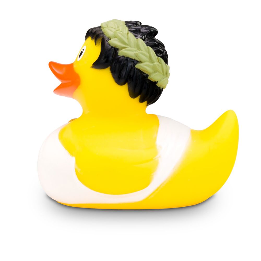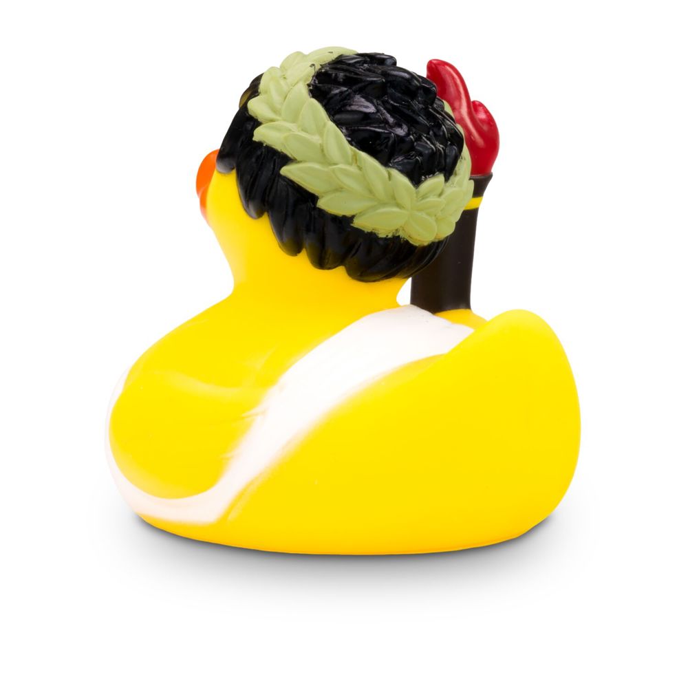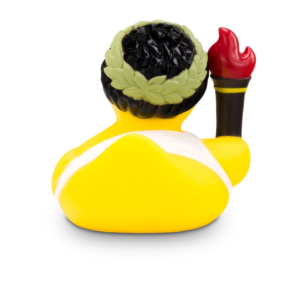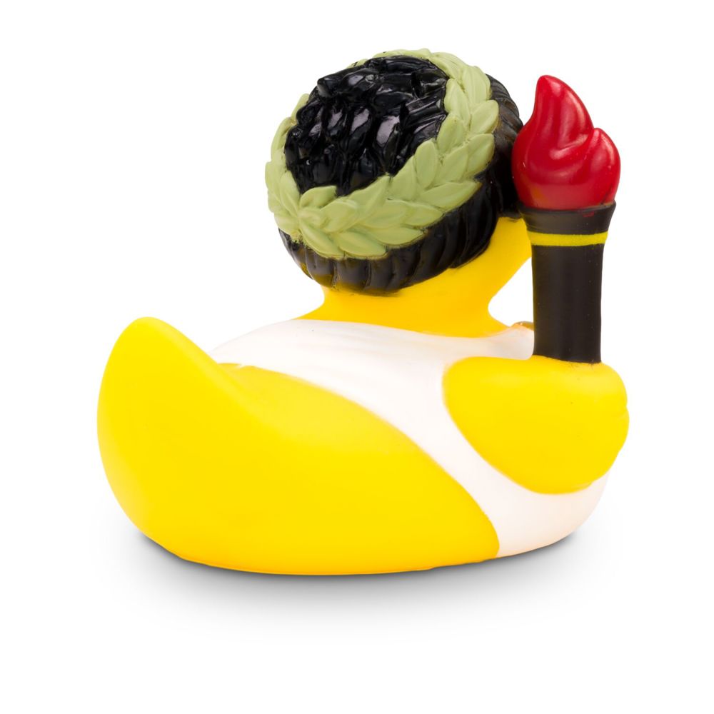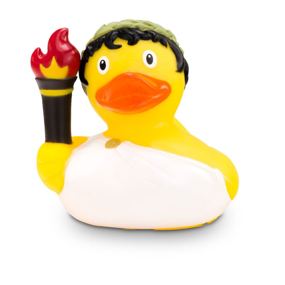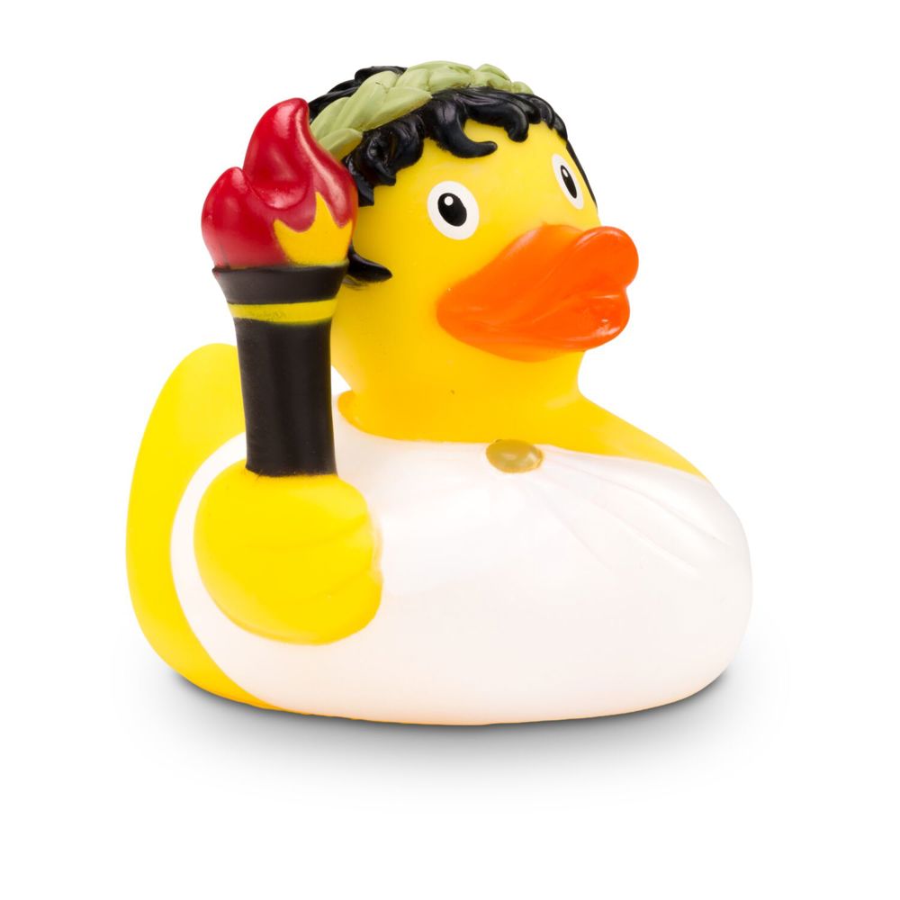 Ole Olympia war schon einmal als Wettkämpfer bei den Olympischen Spielen. Dabei sein ist alles! Nach all den sportlichen Erfolgen, darf er dieses Jahr sogar die olympische Fackel tragen. Dazu trägt er eine festliche, traditionelle griechische Toga in Weiß und hält die Fackel sicher im Flügel. Voller Stolz trägt er den traditionellen Olivenkranz auf seinen dunklen Locken. Diese Badeente ist der perfekte Motivator für Leistungssportler aller Sportarten. Größe: ca. 8 cm. Inklusive Quietschventil