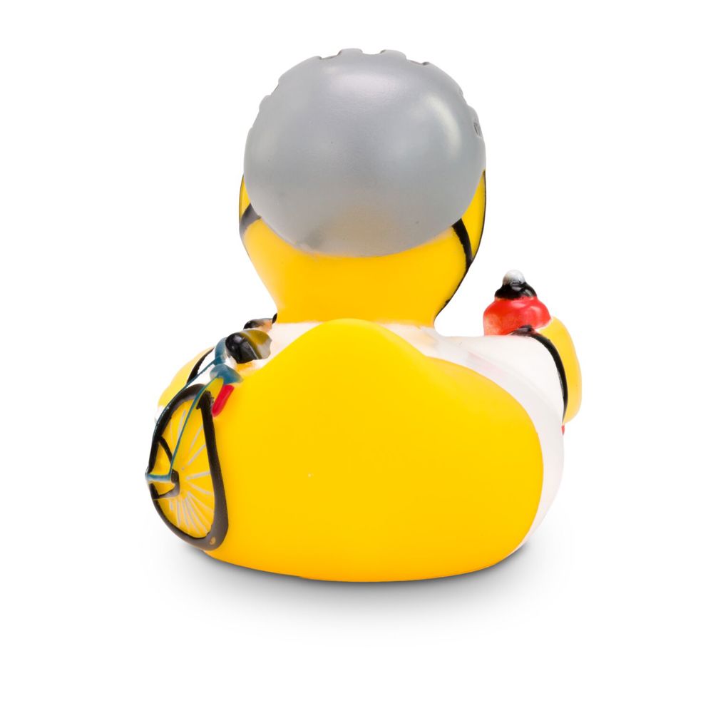 Während die anderen Enten gemütlich im Teich dümpeln, erklimmt Roland Radler mit seinem Fahrrad die erste Bergetappe, denn er möchte irgendwann einmal die Tour de France gewinnen. Mit einem windschnittigen Fahrradhelm und einer roten Trinkflasche im Flügel ist er allzeit bereit in die Pedale zu treten. Größe: ca. 8 cm. Inklusive Quietschventil