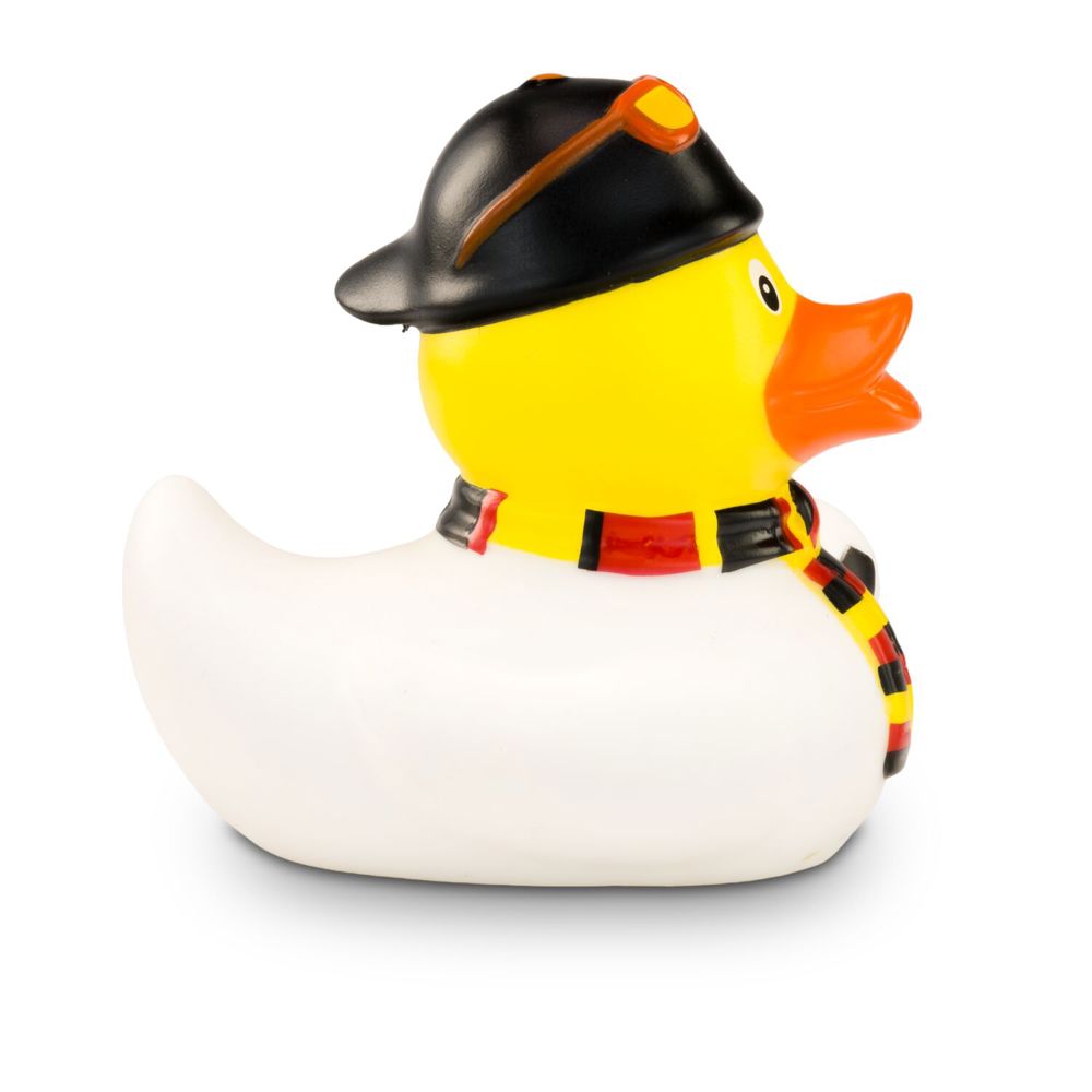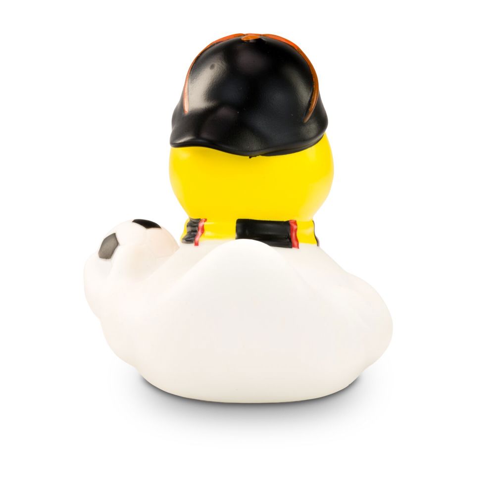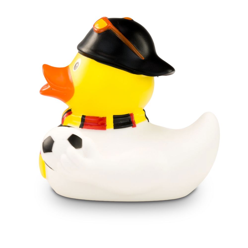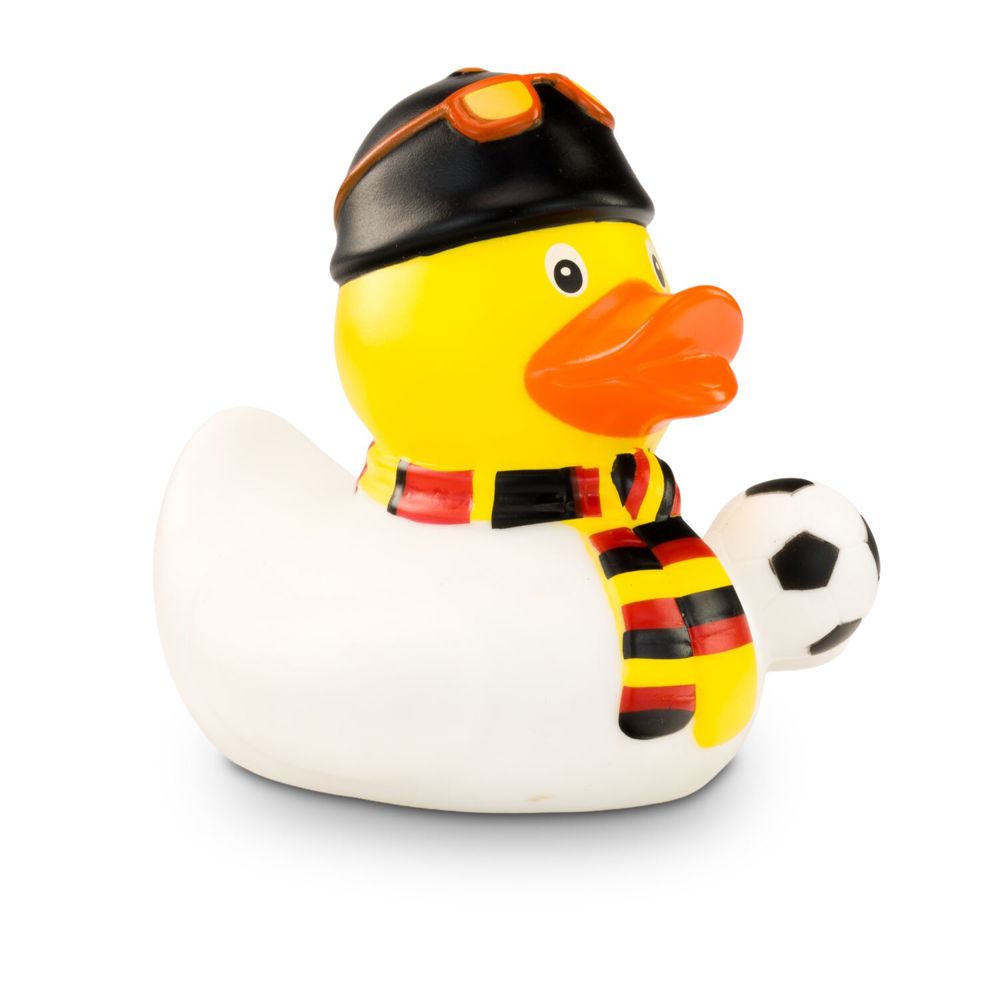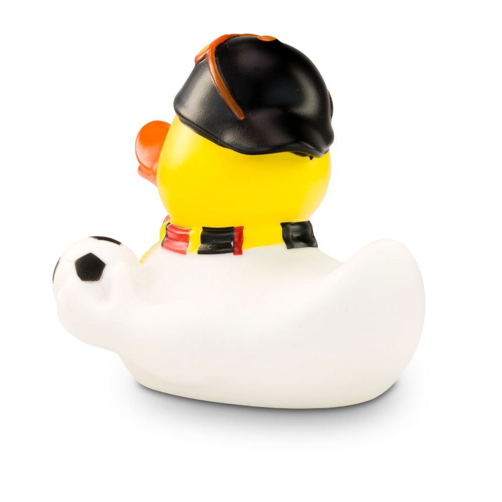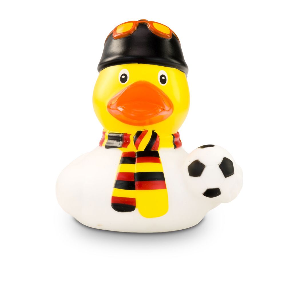 TOOOR! Sandro Stadion ist begeisterter Fußball-Fan und feuert die deutsche Nationalmannschaft lautstark an. Passend dazu trägt er neben seinem weißen Trikot einen Fanschal in schwarz-rot-gold und eine schwarze Mütze mit roter Sonnenbrille darauf. Unter dem Flügel hält er einen Fußball griffbereit. Größe: ca. 8 cm. Inklusive Quietschventil