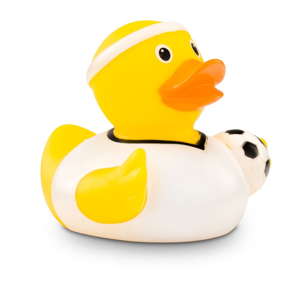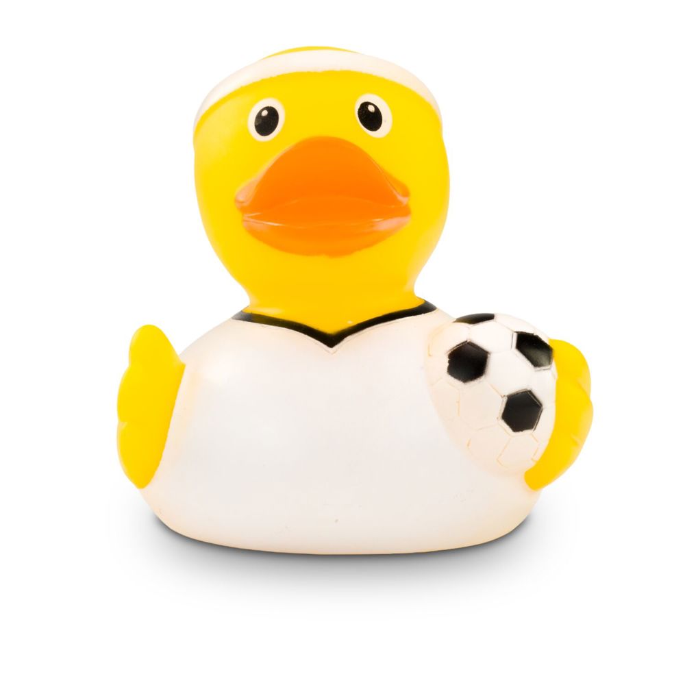 Fritz Freistoß ist der gefürchtetste Stürmer in der Enten-Fußballliga! In seinem weißen Trikot, dem Stirnband auf dem Kopf und mit Ball unter dem Arm macht er sich gerade bereit für den nächsten Strafstoß. Als Profi-Fußballer bringt er Stadion-Feeling in die Badewanne. Größe: ca. 8 cm. Inklusive Quietschventil