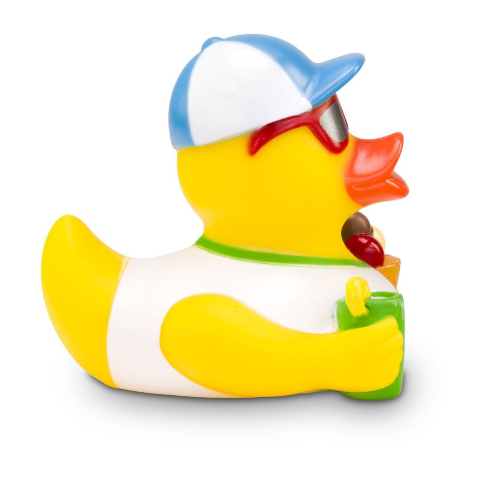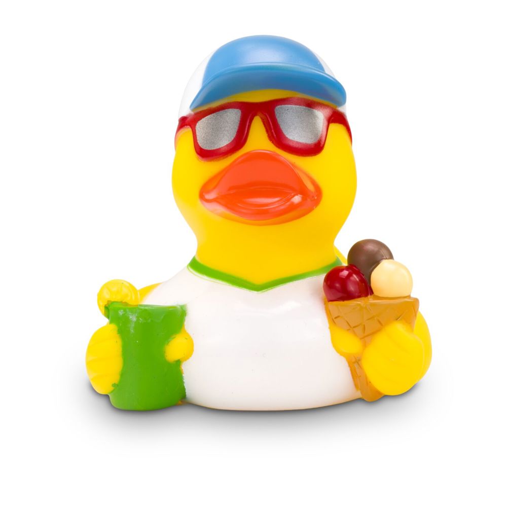 Simon Sommer ist der Sonnenkönig schlechthin. Mit cooler Sonnenbrille, lässiger Cap und weißem Shirt stürzt er sich in den Sommer. Damit er bei den Temperaturen nicht überhitzt, schlürft er ein leckeres Eis und einen erfrischenden Drink mit Zitrone. So genießt er den Sommer in vollen Zügen. Größe: ca. 8 cm. Inklusive Quietschventil
