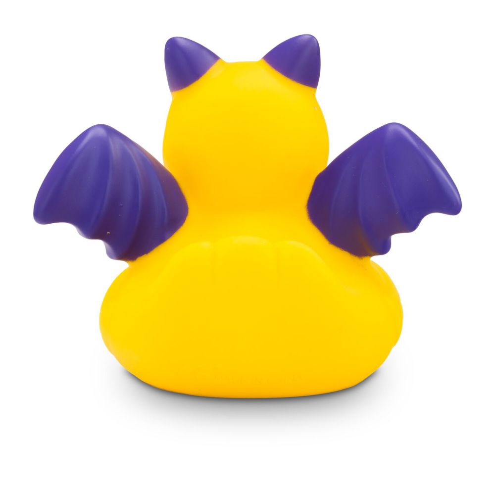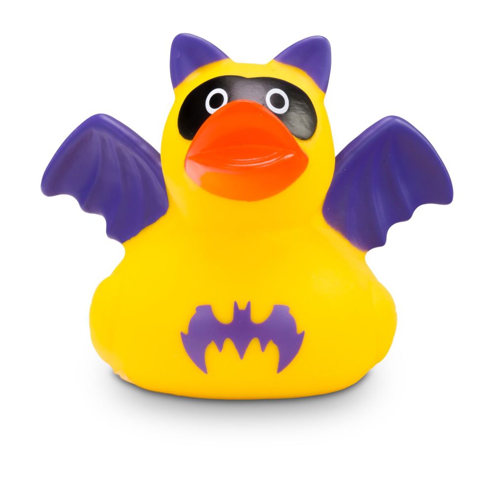 Batduck, die Superhelden-Quietscheente für alle Comic-Fans im gelb-lila Fledermauslook: Mit schwarzer Augenmaske, lila Flügeln, spitzen Ohren und lila Fledermaus-Logo auf der Brust ist diese Badeente bereit für große Heldentaten in der Badewanne. Größe: ca. 8 cm. Inklusive Quietschventil