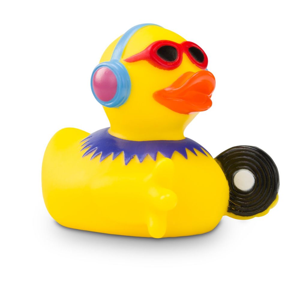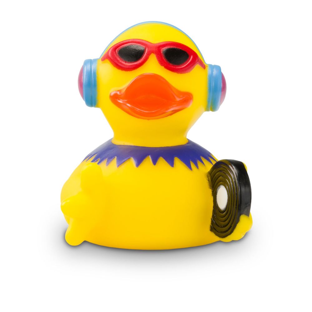 Badeente Danny Disco darf auf keiner Party fehlen. Als DJ heizt er dem Publikum ordentlich ein und hat immer die richtige CD und Schallplatte parat. Mit seiner roten Sonnenbrille, den blauen Kopfhörern und der lila Kette sieht er zudem richtig cool aus. Größe: ca. 8 cm. Inklusive Quietschventil