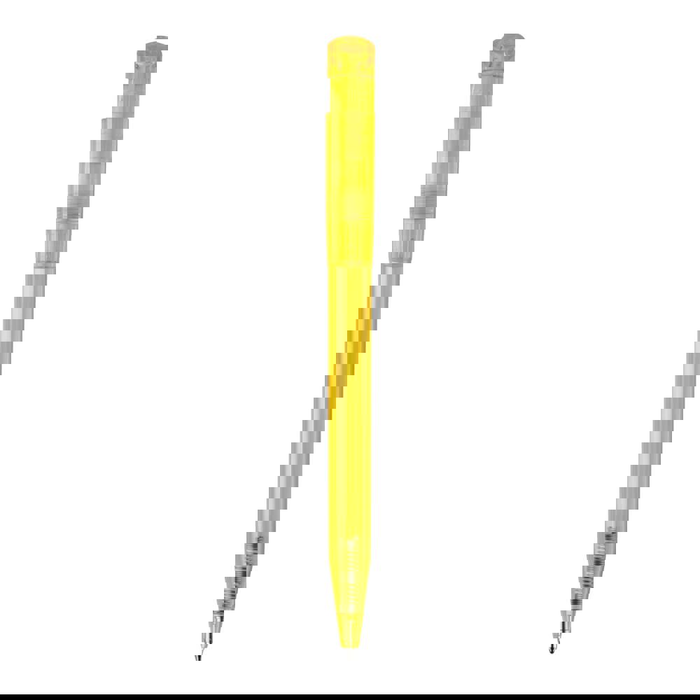 Moderner transparenter Kugelschreiber mit gebogenem Clip. Ein beliebter Werbeartikel wegen seiner... mehr