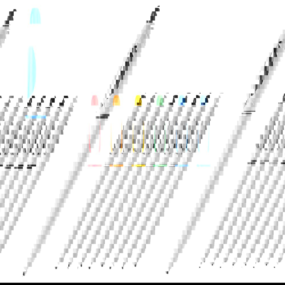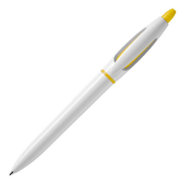 Der Hardcolour Kugelschreiber S! mit weißem Schaft und weißen Clip. Der Drücker und der Ring sind farbig. Ausgestattet mit einer blau schreibenden X20-Refill-Mine. Der Kugelschreiber besteht aus ABS und wird in Europa hergestellt. Ab einer Abnahmemenge von 5.000 Stück sind eigene Farbkombinationen möglich.