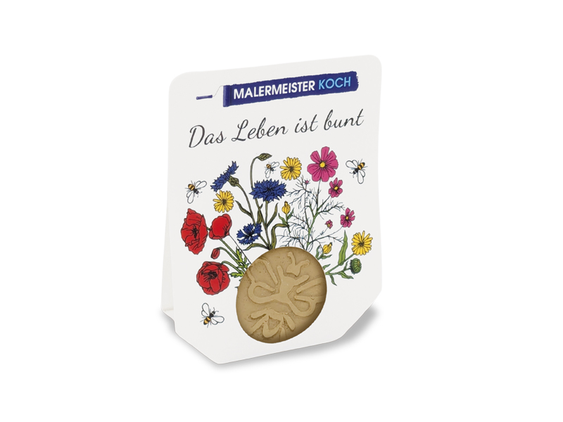 Das handgefertigte Bienenmedaillon ist nicht nur eine Freude für die Bienen, auch Ihre KundInnen werden sich über die farbenfrohen Blüten erfreuen. Die umliegende Banderole bietet viel Platz für individuelle Gestaltungen und vielfältige Werbebotschaften. *** INDIVIDUELLE GESTALTUNG DER BANDEROLE MÖGLICH. Saatsorte im Tonmedaillon: Bienenblumen