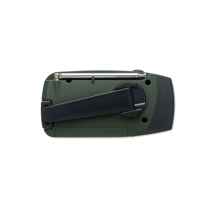 Tragbares AM/FM-Radio mit LED-Taschenlampe (2 Einstellungen) und 1200mAh Powerbank zum Notfall-Aufladen. Aufladen per Solarladefunktion und Handkurbel-Dynamo. ABS.