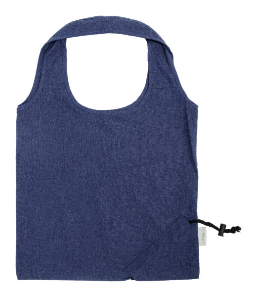 Faltbare Einkaufstasche aus 70 % recycelter Baumwolle und 30 % RPET-Polyester, 140 g/m². Mit Label recycelte Baumwolle.