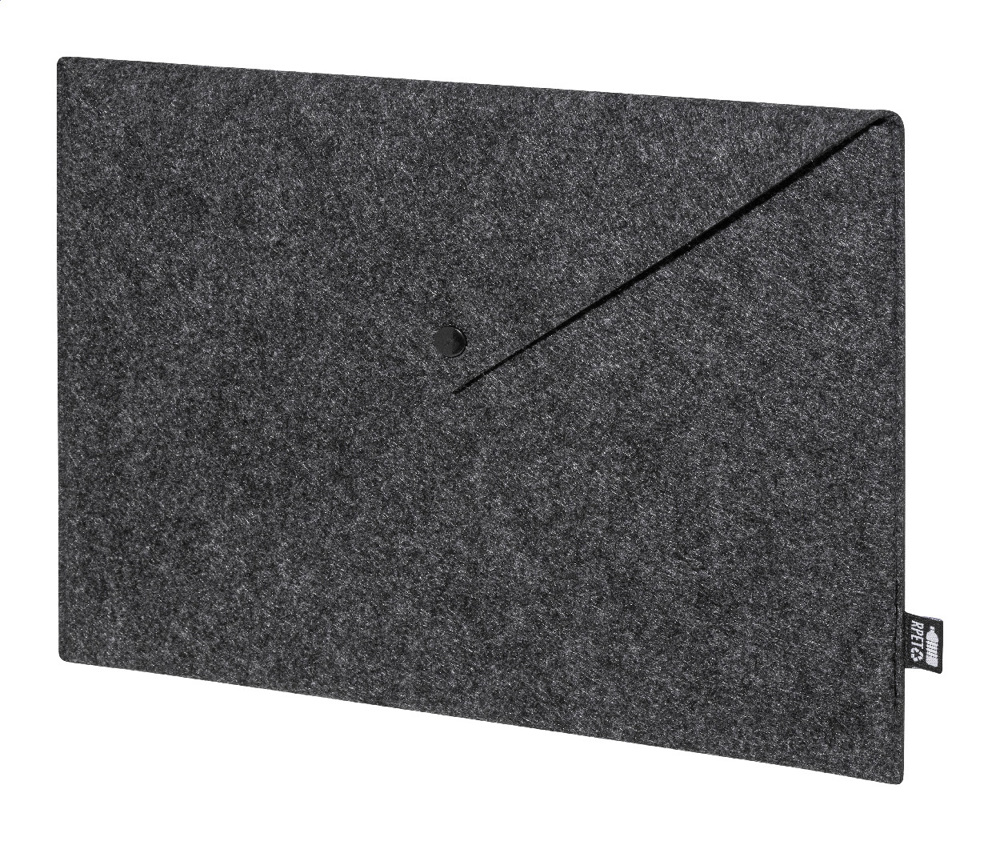 Dokumenten- oder Laptoptasche aus RPET-Filz mit Druckknopfverschluss. Passend für Laptops bis 13 Zoll. Mit RPET-Label.