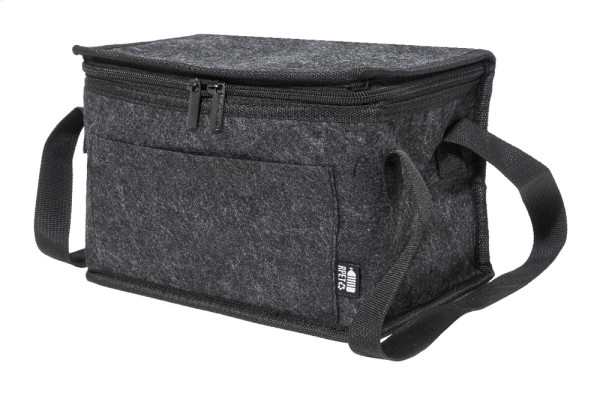 Kühltasche aus RPET-Filz mit Reißverschluss, Aluminiumpolsterung, Fronttasche und seitlichen Tragegriffen. Mit RPET-Label.