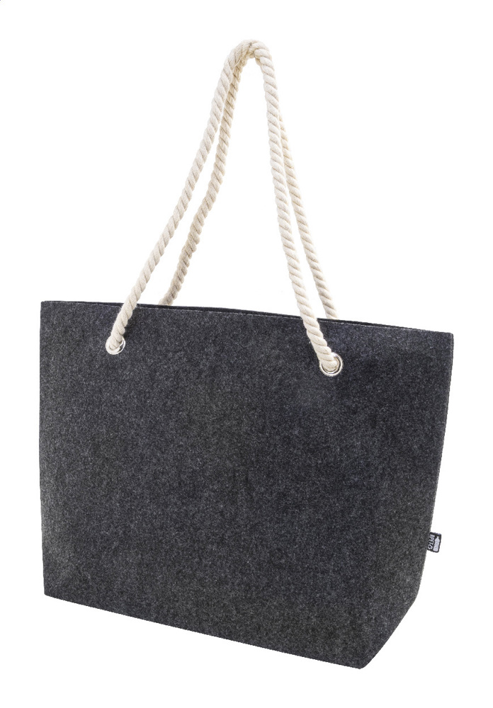 Strand- oder Einkaufstasche aus RPET-Filz mit Baumwollkordelgriffen und Bodenfalte. Mit RPET-Label.