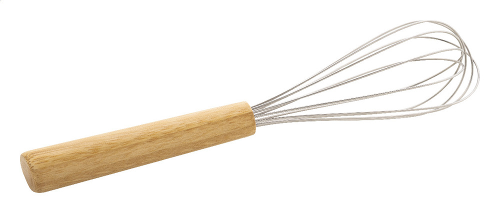 Schneebesen aus Edelstahl mit Bambusgriff.