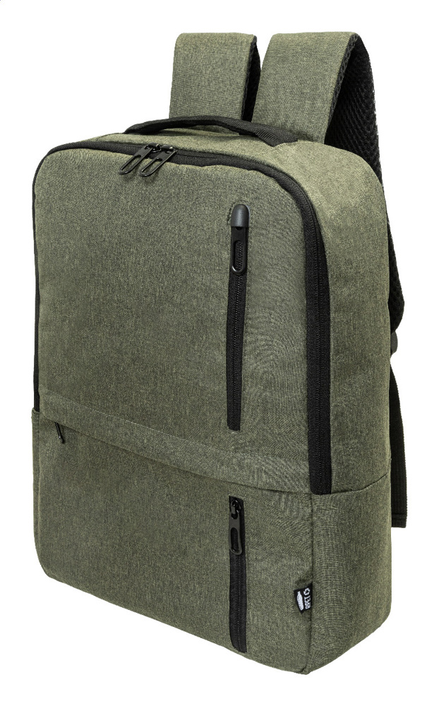 RPET-Rucksack mit Reißverschluss-Hauptfach und 3 Reißverschluss-Fronttaschen. Mit gepolstertem Tablet- (10") und Laptop-Fach (15"), gepolstertem Rücken und gepolsterten Schultergurten. Material: 600D RPET-Polyester. Mit RPET-Label.