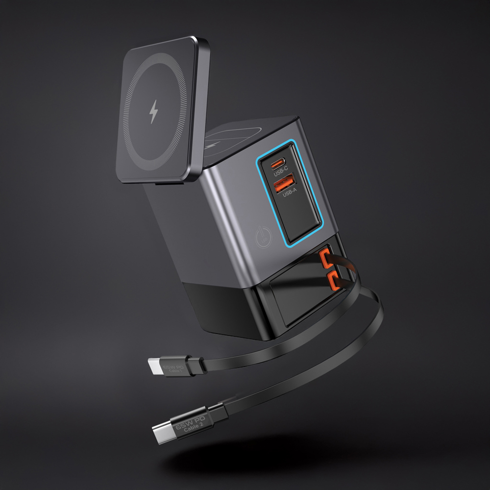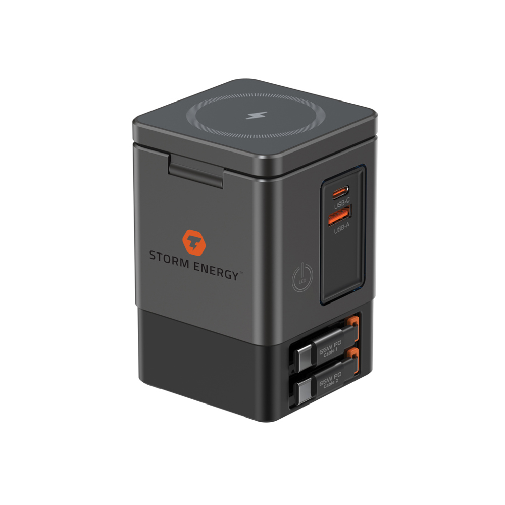 Die All-in-One-Power-Solution. Sacramento ist eine 105W-GaN-Ladestation, die maximale Leistung mit integriertem Komfort verbindet. Mit zwei integrierten, einziehbare 65W-USB-C-Kabel, sodass Sie immer schnell aufladen können – ganz ohne zusätzliche Kabel. Sacramento verfügt zudem über einen USB-A- und einen USB-C-Anschluss, sodass Sie insgesamt vier Output-Optionen zum gleichzeitigen Laden von Laptops, Tablets, Smartphones und mehr haben. Für Ihre kabellosen Geräte ist Sacramento mit einem leistungsstarken 15W-Magnet-Wireless-Charger ausgestattet, der Ihr Smartphone sicher an seinem Platz hält, sowie einem separaten Wireless-Pad, das speziell für kleinere Geräte wie Ohrhörer oder AirPods (max. 5W) entwickelt wurde. Sacramento wird aus RCS-zertifiziertem (Recycled Claim Standard) recyceltem, feuerfestem PC hergestellt. Gesamtanteil an recycelten Materialien: 26 % bezogen auf das Gesamtgewicht des Artikels.