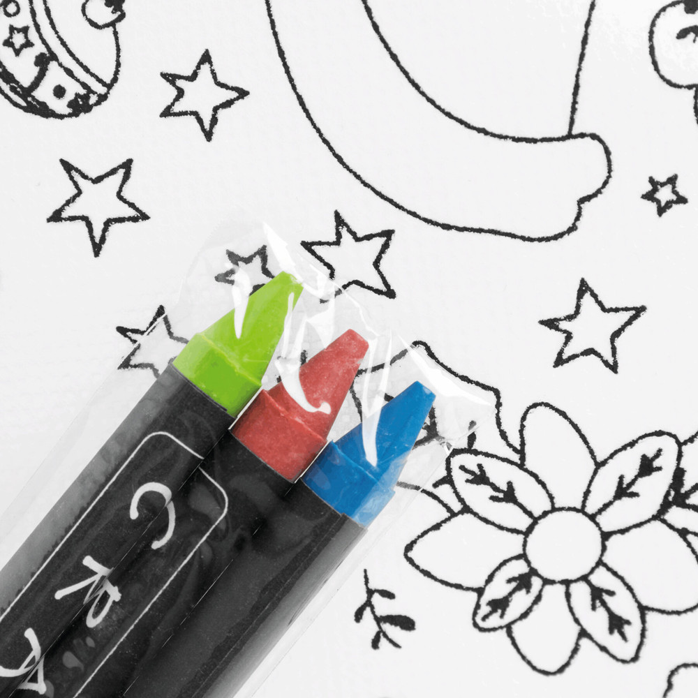Bemalbarer Turnbeutel COLOURFUL SNOWMAN: mit Kordelzug und Weihnachtsmotiv zum Ausmalen auf der Vorderseite, inkl. 3 verschiedenfarbigen Wachsmalstiften (rot, grün, blau)