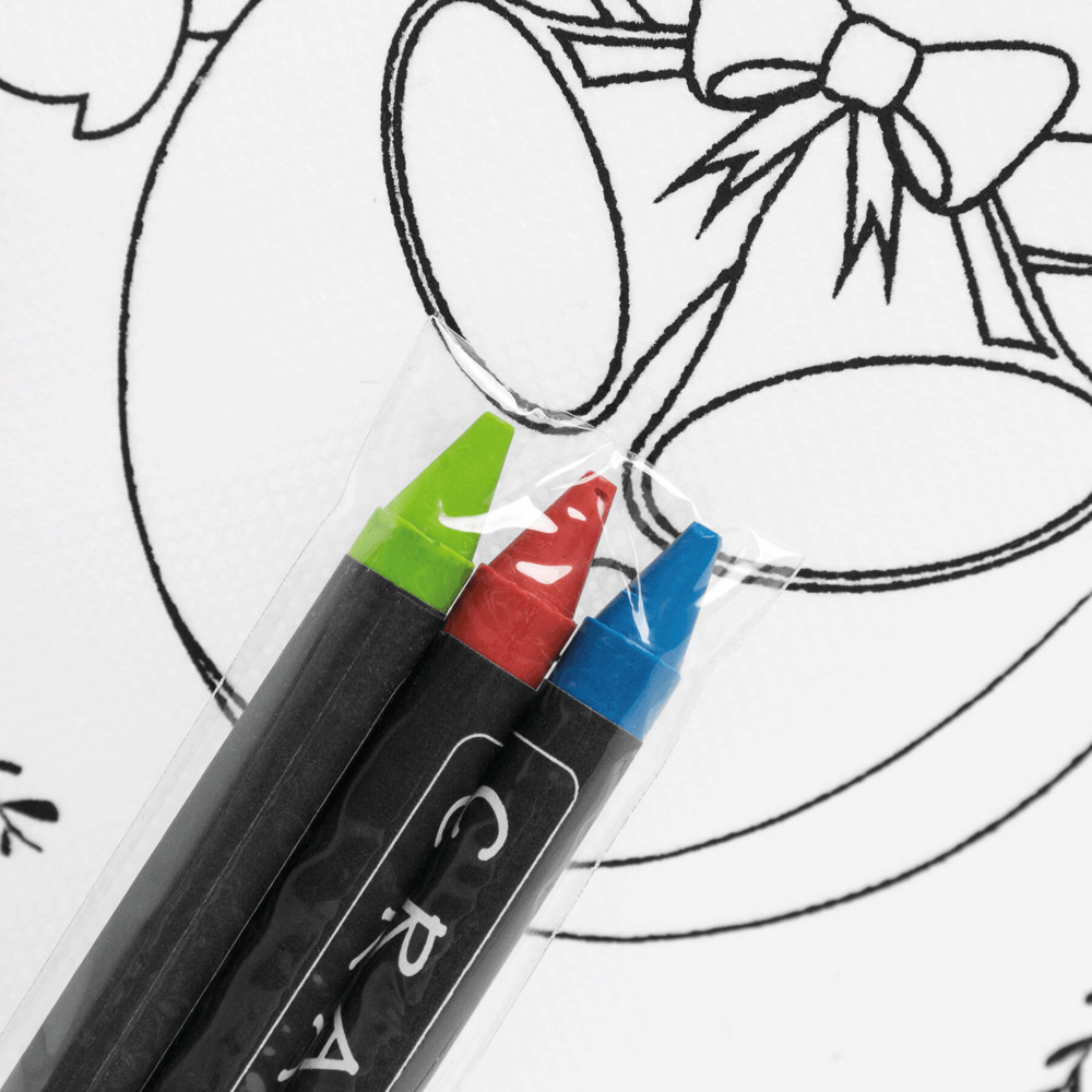 Bemalbarer Turnbeutel COLOURFUL SNOWMAN: mit Kordelzug und Weihnachtsmotiv zum Ausmalen auf der Vorderseite, inkl. 3 verschiedenfarbigen Wachsmalstiften (rot, grün, blau)