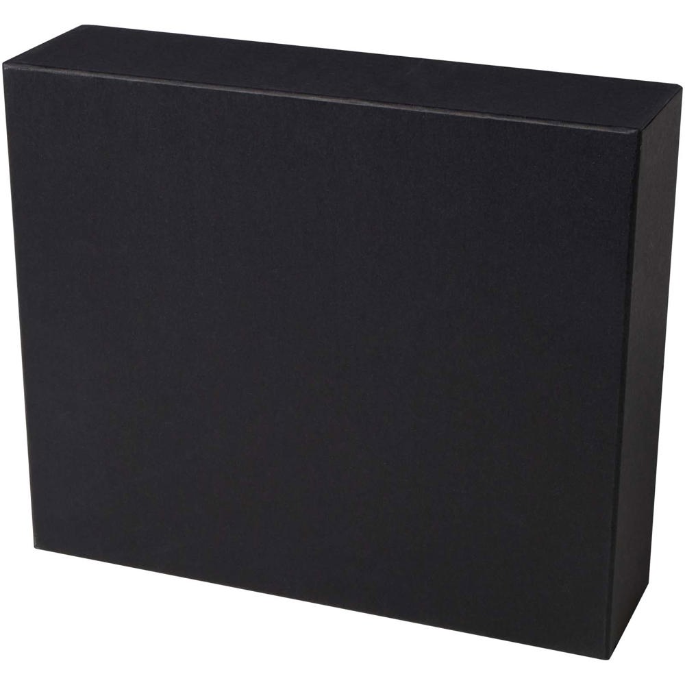 Das Laura Set enthält ein Hardcover Notizbuch aus RPET im Format A5, einen Kugelschreiber, eine Keramiktasse und einen Untersetzer. Das Notizbuch ist mit einem elastischen Verschluss und Lesebändchen versehen und besteht aus 80 Blatt liniertem, cremefarbenem 80 g/m² Papier. Die Notizbuchhülle dient zusammen mit dem Halbkreis aus Bambus als Telefonhalterung. Der Kugelschreiber besteht aus RCS-zertifiziertem recyceltem Aluminium mit schwarzer Pulverbeschichtung und Bambusaccessoires auf beiden Seiten des oberen Schaftes. Tinte: Schwarz. Schreiblänge: 400 Meter. Die Keramiktasse mit einem Fassungsvermögen von 480 ml wird mit einem Untersetzer aus Bambus geliefert. Nur von Hand reinigen. Größe der Tasse: 11 × 12,7 cm. Durchmesser Untersetzer: 9,5 cm. Größe der Geschenkbox: 32 x 27 x 10,3 cm.