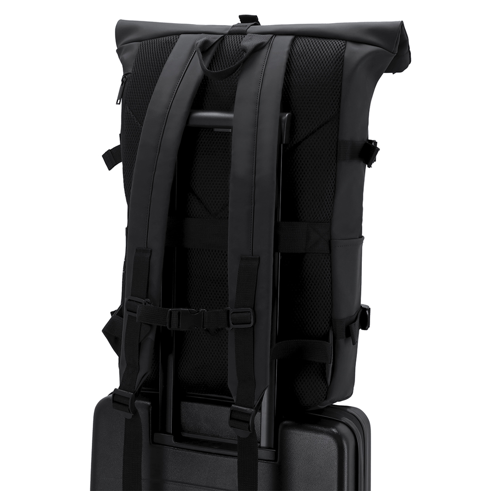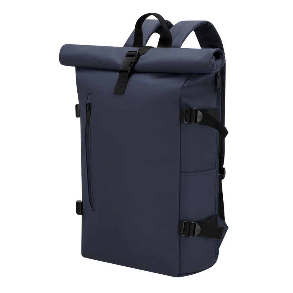 Rucksack aus weichem PU mit Rollverschluss mit Reißverschluss und Schnalle. Mit Fronttasche und Rücktasche mit seitlichem Zugang, beide mit unsichtbaren Reißverschlüssen, sowie zwei zusätzlichen Seitentaschen. Geräumiges Innenfach mit gepolstertem Fach für Laptops bis 15 Zoll. Verstellbare Seitengurte ermöglichen eine flexible Anpassung des Volumens. Schultergurte aus PU und gepolsterte Rückenpartie für höheren Komfort. Brustgurt mit Schnalle für sicheren Halt. Mit rückseitigem Band zur Befestigung am Trolley oder Koffer – ideal für Reisen und Pendeln.