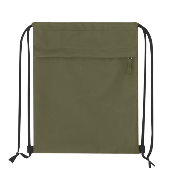 Kordelzug-Rucksack aus weichem PU kombiniert mit robustem 600D-Polyester. Mit funktionaler Fronttasche mit Reißverschluss und farblich passendem PU-Zipper.