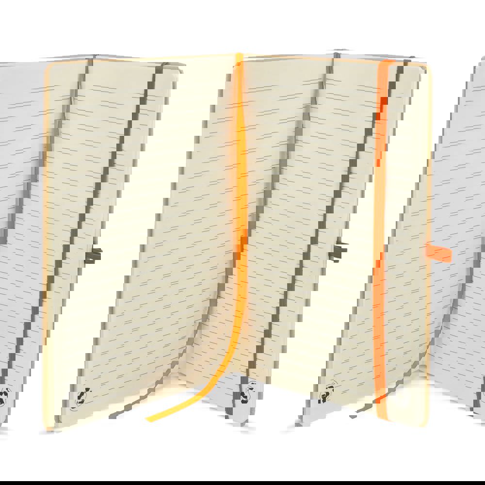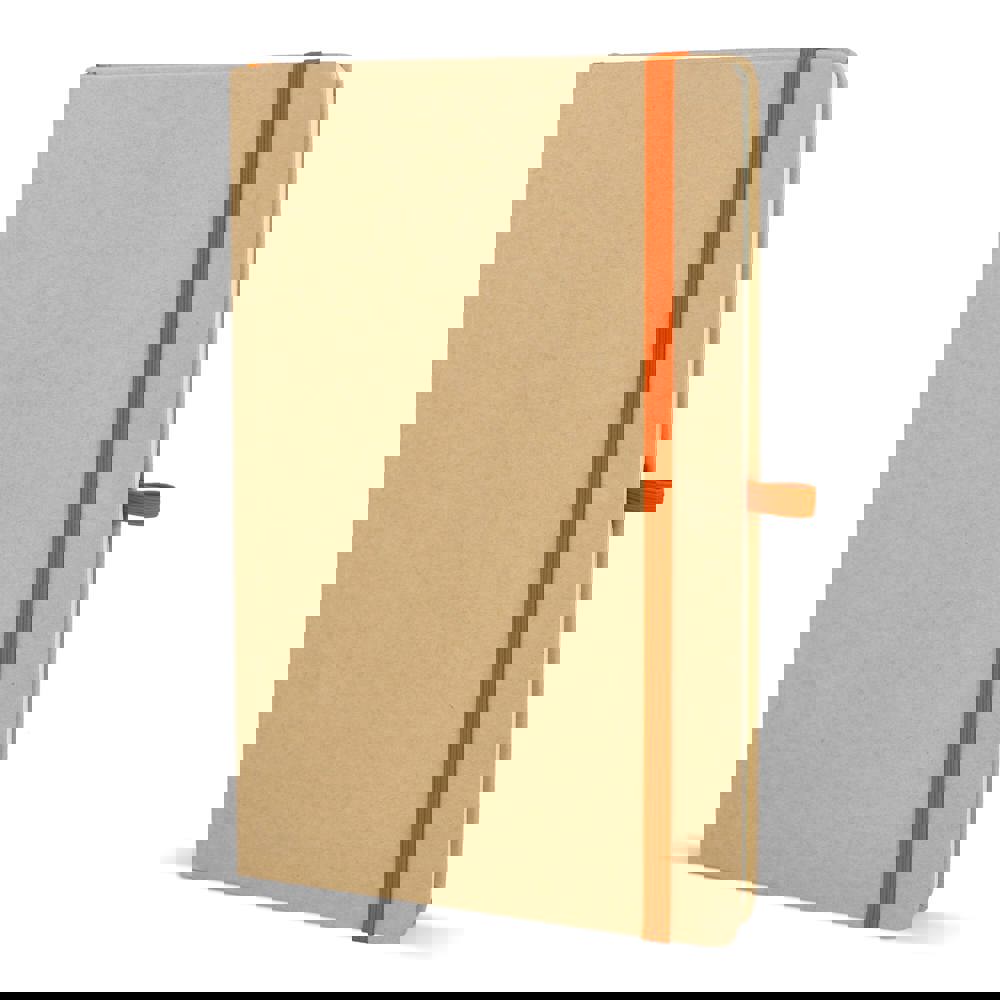A5-Notizbuch mit Kartoneinband, abgerundeten Ecken, farbigem Gummiverschluss, Lesebändchen und Stiftschlaufe. Enthält 80 linierte cremefarbene Blätter aus Recyclingpapier. Eine praktische, umweltbewusste Wahl für den täglichen Gebrauch.