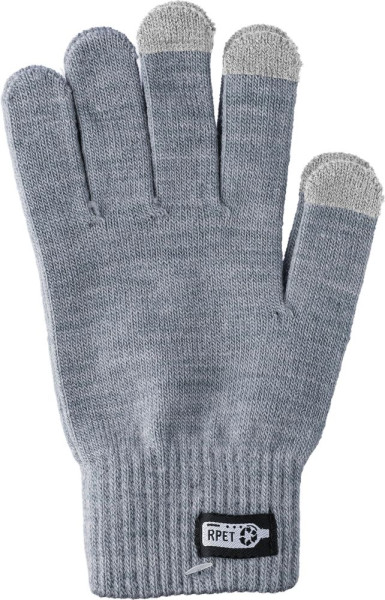 Die rPET-Touchscreen-Handschuhe verfügen über eine leitfähige Beschichtung an drei Fingern, die die Verwendung von Bildschirmen ermöglicht, Größe S/M. Sie enthalten ein rPET-Etikett auf der Außenseite und ein Waschetikett mit Informationen auf der Innenseite.