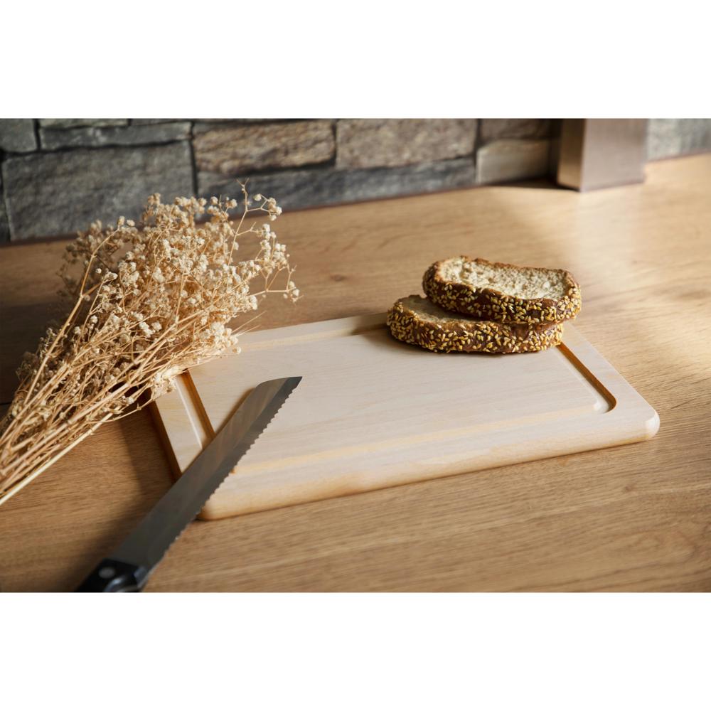 Einfach praktisch und unverzichtbar für jeden Haushalt. 15 mm starkes Schneid- oder Brotzeitbrett. Mit gefräster Rille am Rand gegen Herunterfließen von Flüssigkeiten. Hergestellt aus unbehandeltem Buchenholz. Ausschließlich von Hand spülen.