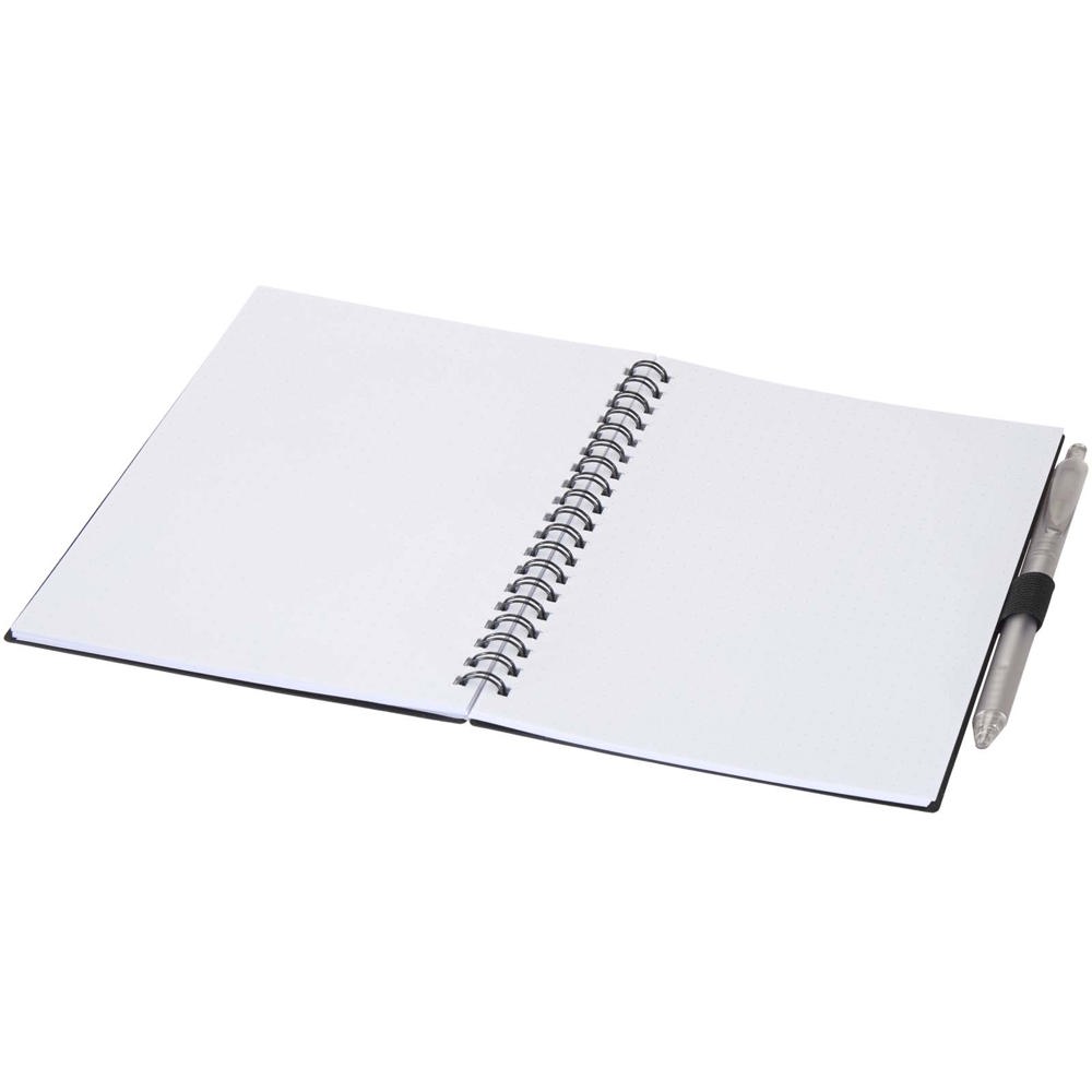 Das Niove Softcover-Notizbuch besteht aus recyceltem Kunststoff und enthält 70 punktkarierte Seiten aus 70 g/m² Papier. Das Notizbuch hat abgerundete Ecken und eine Stiftschlaufe. Notizbuchformat: 140 × 178 mm. Der Kugelschreiber besteht ebenfalls aus recyceltem Kunststoff. Tintenfarbe: Blau. Schreiblänge: 1000 Meter. Schreibspitze: 1,0 mm.