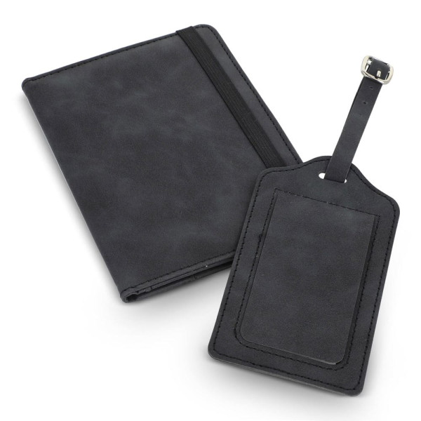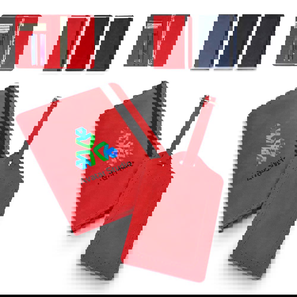 Reiseset mit PU-Reisedokumentetui mit RFID-Schutz, elastischem Verschluss, Platz für Pass, 4 Kreditkarten, 2 SIM-Karten, weitere Fächer (z. B. Bordkarten). Inkl. Gepäckanhänger mit Schnallenriemen und Kontaktkarte (Name, Telefon, Adresse, E-Mail) auf Englisch.