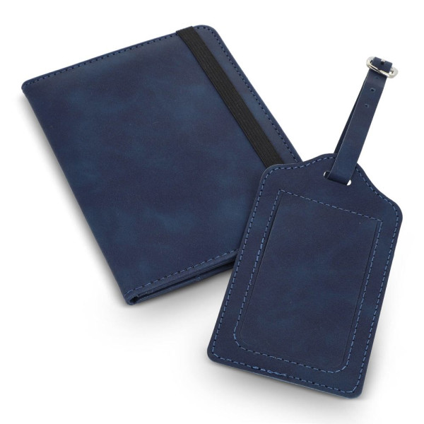 Reiseset mit PU-Reisedokumentetui mit RFID-Schutz, elastischem Verschluss, Platz für Pass, 4 Kreditkarten, 2 SIM-Karten, weitere Fächer (z. B. Bordkarten). Inkl. Gepäckanhänger mit Schnallenriemen und Kontaktkarte (Name, Telefon, Adresse, E-Mail) auf Englisch.