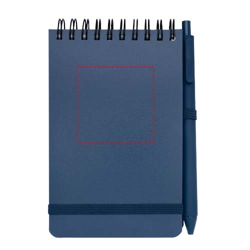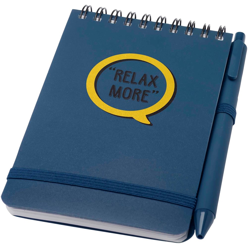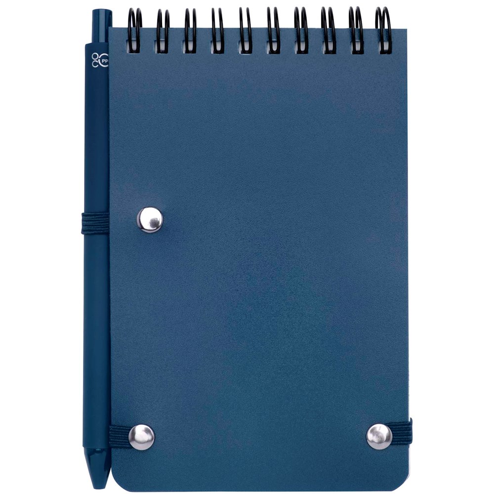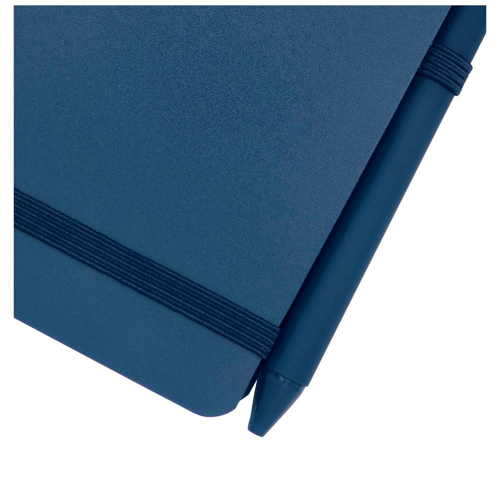 Das Thalaasa A6 Hardcover Notizbuch besteht aus recyceltem ozeangebundenem Kunststoff und umfasst 80 Blatt, liniert, aus cremefarbenem 70 g/m² Papier. Das Notizbuch hat abgerundete Ecken. Es ist mit einem elastischen Verschluss und einer Stiftschlaufe ausgestattet. Der Kugelschreiber mit schwarzer Tinte ist ebenfalls aus recyceltem, ozeangebundenem Kunststoff hergestellt. Schreiblänge: 1000 Meter. Spitzengröße: 1,0 mm.
