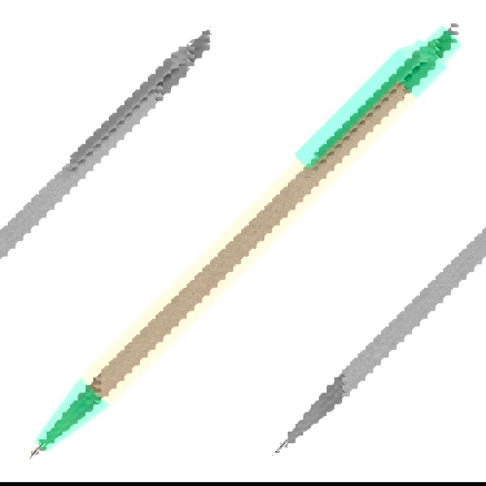 Papierkugelschreiber mit farbigen Kunststoffteilen aus recyceltem Material. Mit blauer Schreibmine.