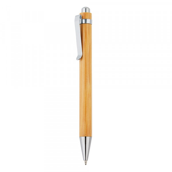 Schwarzschreibender Kugelschreiber mit Schaft aus Bambusholz mit Metall-Clip.