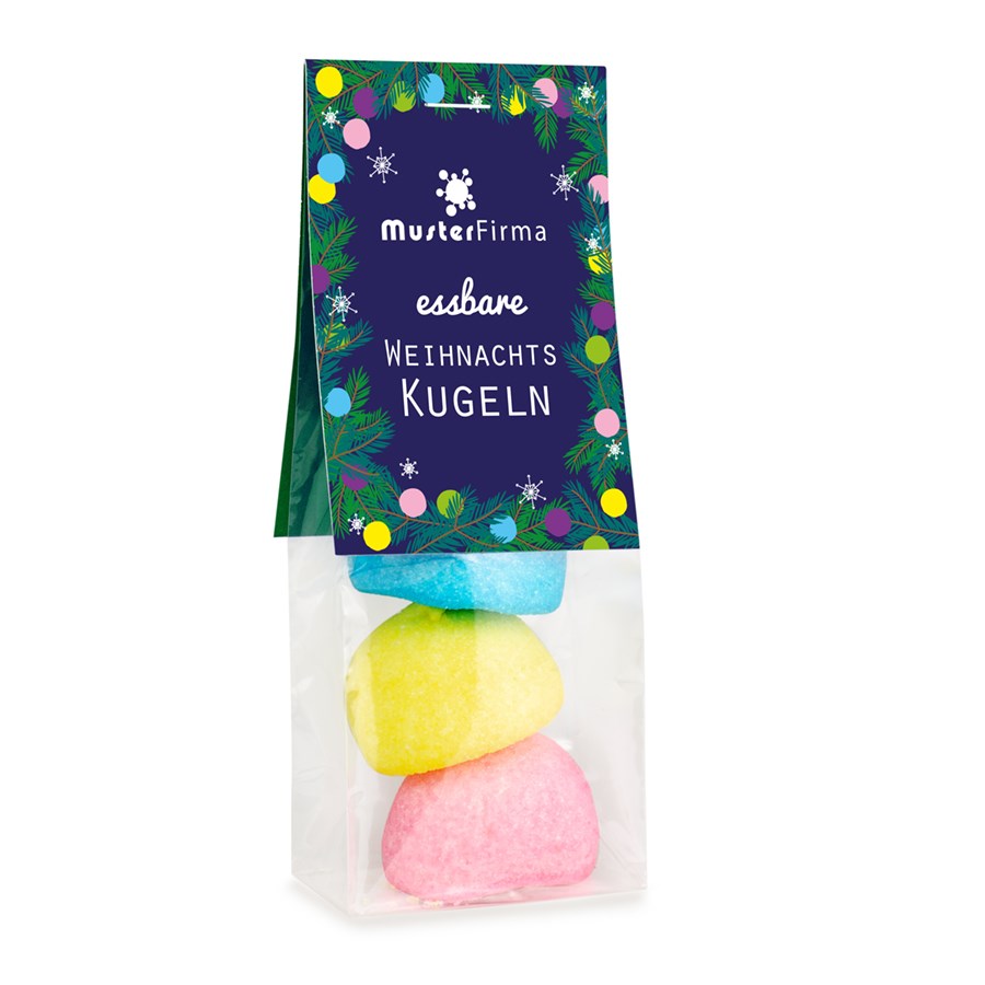 Lieferzeit: 14 Werktage nach Druckfreigabe Haltbarkeit: 12 Monate bei sachgerechter Lagerung Inhalt: 3 Schaumzucker Kugeln Druckfläche: 172 x 55 mm, Klappkarte beidseitig Größe: 145 x 55 x 35 mm VPE: 50