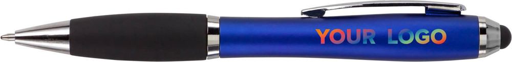 Kugelschreiber aus Kunststoff, mit Drehfunktion, Metall-Clip, gummierter Griffzone, Touchpen und schwarzer Mine.