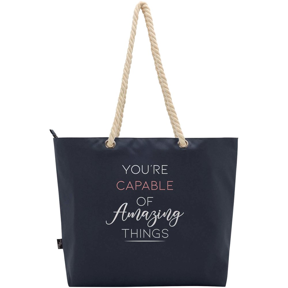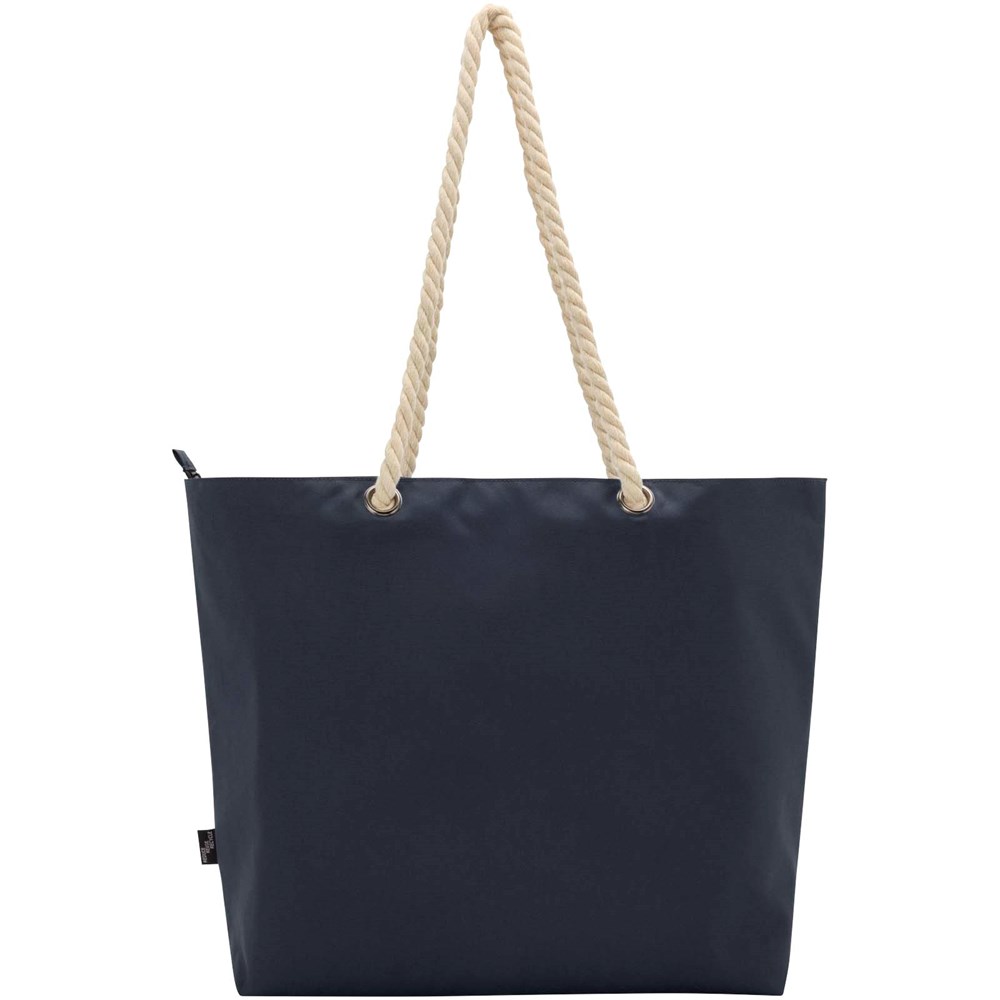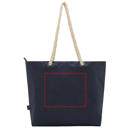 Die Panama Kühltragetasche besteht aus GRS-zertifiziertem Recycling-Polyester und verfügt über ein großes Hauptfach mit Reißverschluss sowie hochwertige Tragegriffe aus Alufolie und Baumwollkordel. Geeignet für verschiedene Aktivitäten wie Einkaufen, einen Tag am Strand oder im Park. Fassungsvermögen: 23 Liter. Beständigkeit bis zu 10 kg. PVC frei.