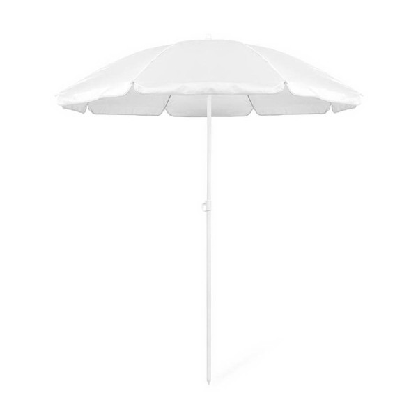 Sonnenschirm mit 8 Panelen aus robustem Nylon in verschiedenen lebendigen Farben. Mit einem Durchmesser von 150 cm, Paspelierung an den Rändern und höhenverstellbaren Metallrohren in Weiß. Präsentiert in einer PVC-Hülle mit Schultergurt.