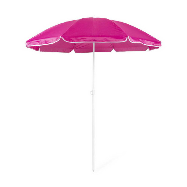 Sonnenschirm mit 8 Panelen aus robustem Nylon in verschiedenen lebendigen Farben. Mit einem Durchmesser von 150 cm, Paspelierung an den Rändern und höhenverstellbaren Metallrohren in Weiß. Präsentiert in einer PVC-Hülle mit Schultergurt.
