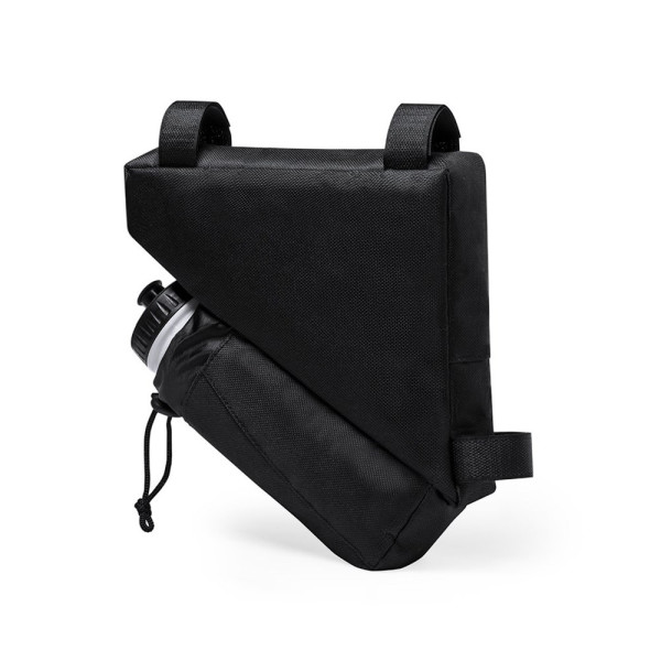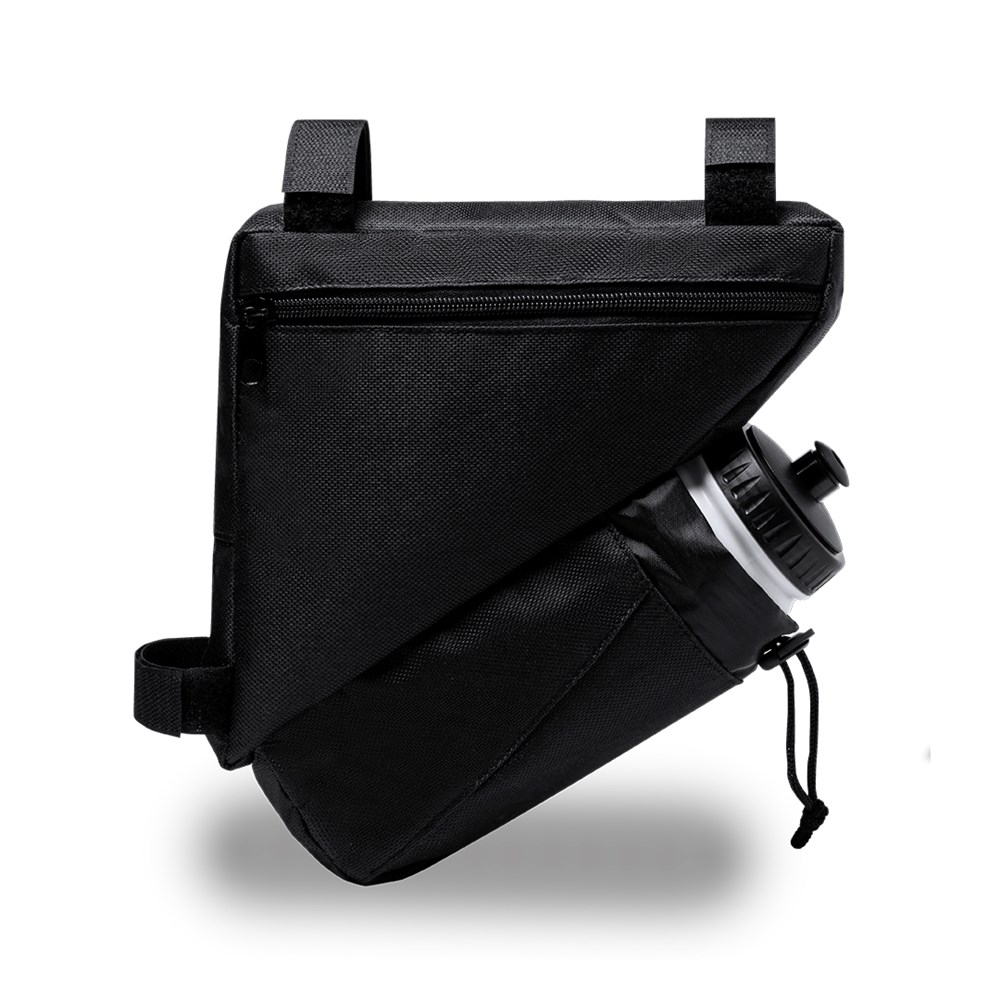 Fahrradtasche aus strapazierfähigem 600D-Polyester mit PVC-verstärkter Innenseite. Erhältlich in schwarz. Hauptfach mit Reißverschluss und universeller Anpassung an den Fahrradrahmen durch 3 Klettbänder. Wasserflaschenfach mit verstellbarem Kordelzug.
