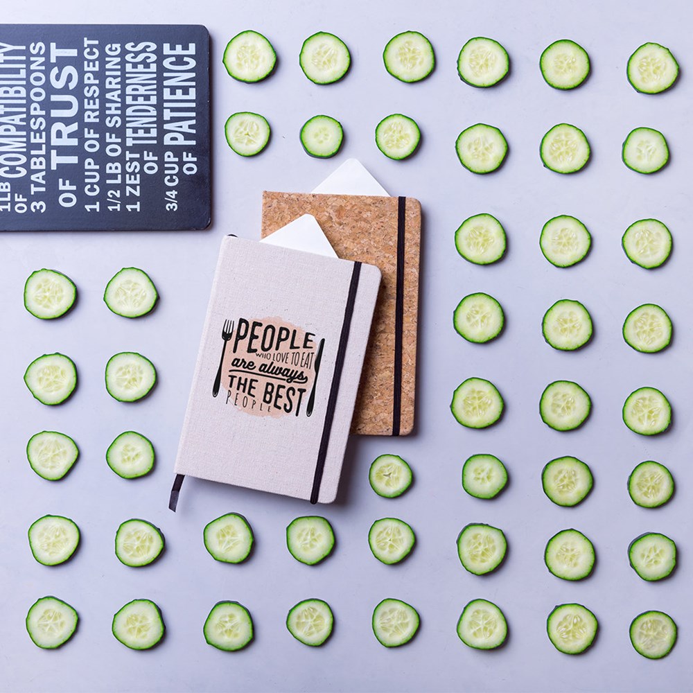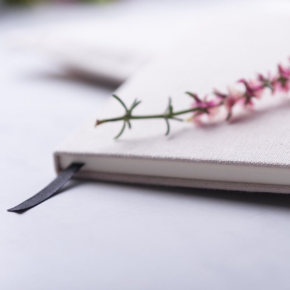 Notizbuch aus natürlichen Materialien. Cover aus weicher, natürlicher Baumwolle in Naturfarbe. Mit Gummibandverschluss und Lesezeichenband in passenden, auffälligen Farben. Enthält 80 Blätter.