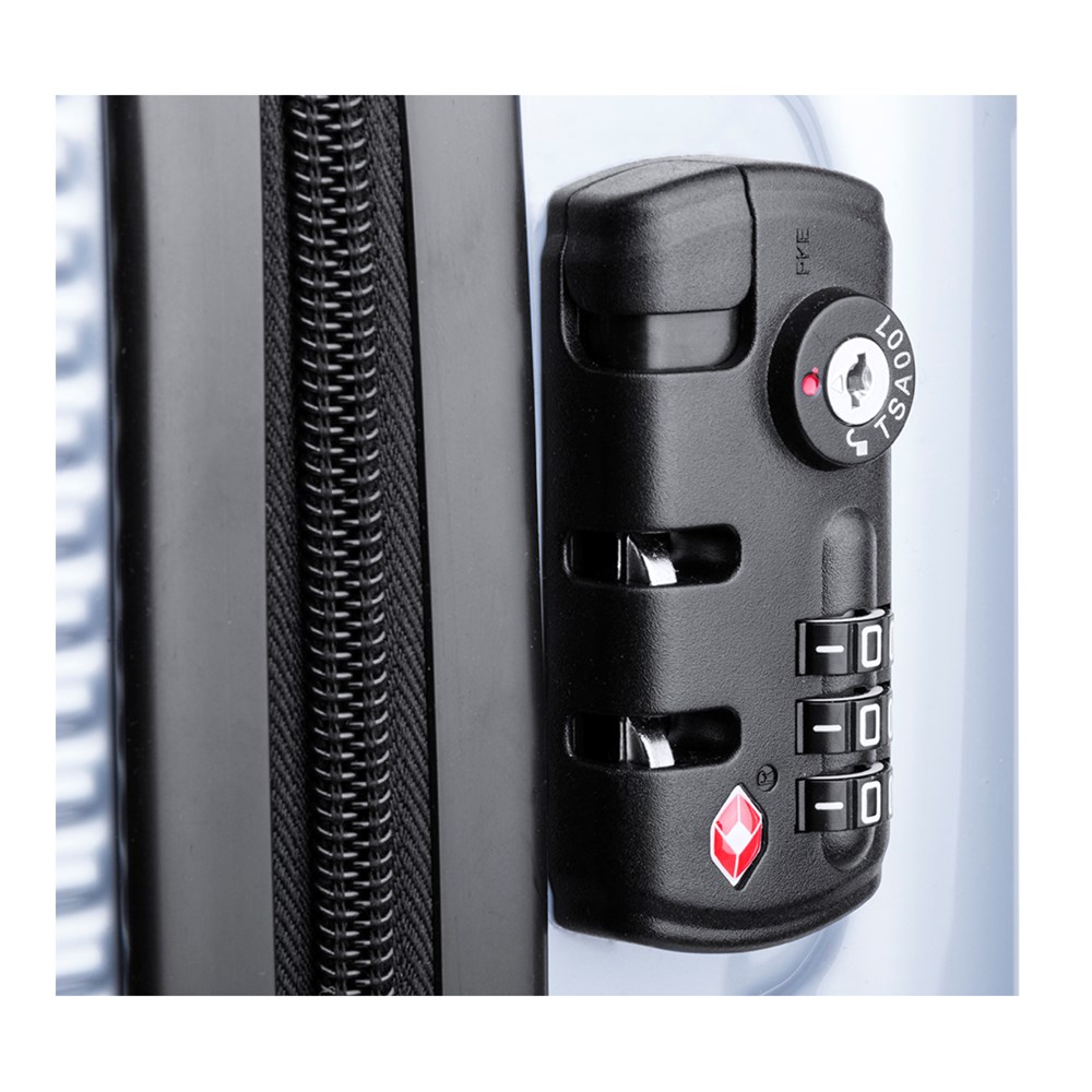 Stabiler Business-Trolley aus robustem Material in silberner Ausführung. Vollständig zu öffnen, mit vier 360-Grad-Rollen und Sicherheitsschloss. Schloss nach der Norm der TSA (Transportation Security Administration), die es den Zollbehörden dank eines speziellen Schlüssels ermöglicht, den Inhalt des Gepäcks zu kontrollieren, ohne das Schloss aufbrechen zu müssen. Hauptfach mit Doppelreißverschluss. Innen gefüttert und mit gepolstertem Fach für Laptops von bis zu 17 Zoll.