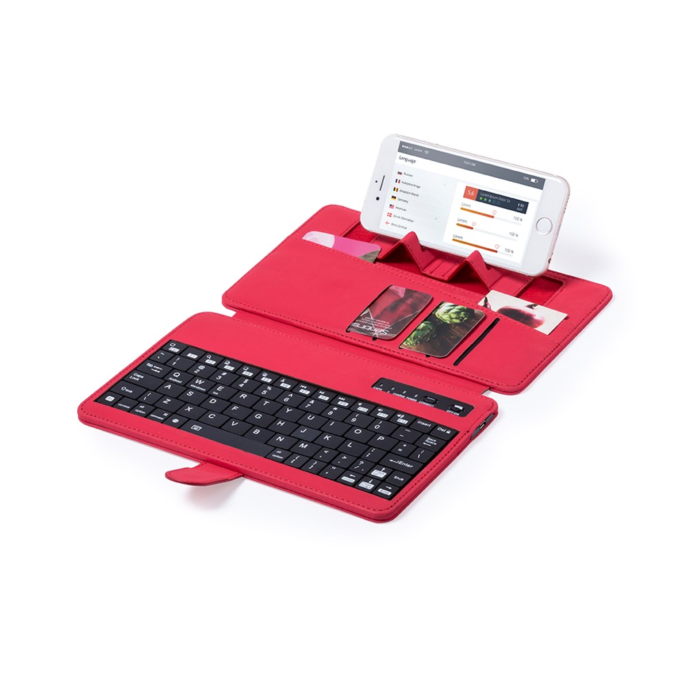 Bluetooth®-Tastatur mit Ständer für Mobilgeräte aus weichem Kunstleder. Mit kompaktem Design in auffälligen Farben, sowie Klappe mit Magnetverschluss und Kartenfächern im Inneren. Aufladbar durch Mini-USB-Kabel (inklusive). Kompatibel mit allen QWERTY-Betriebssystemen. Präsentiert in einer attraktiven Designbox.