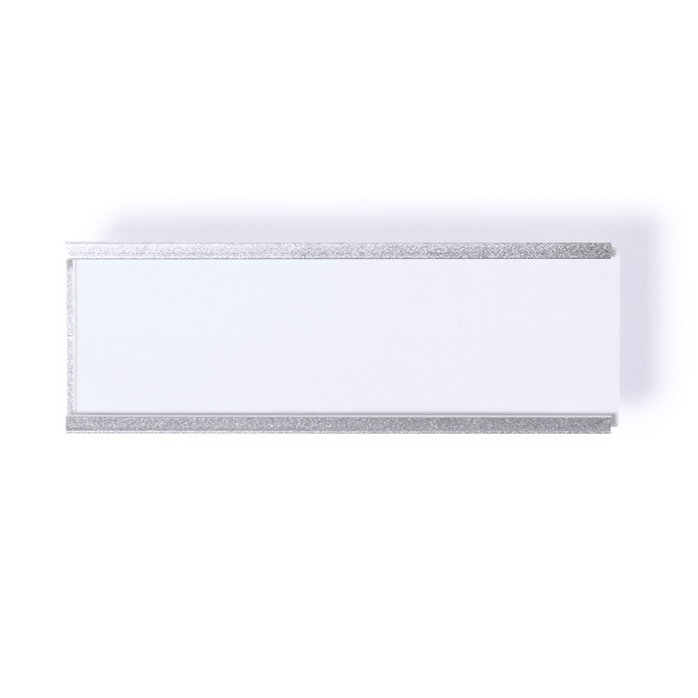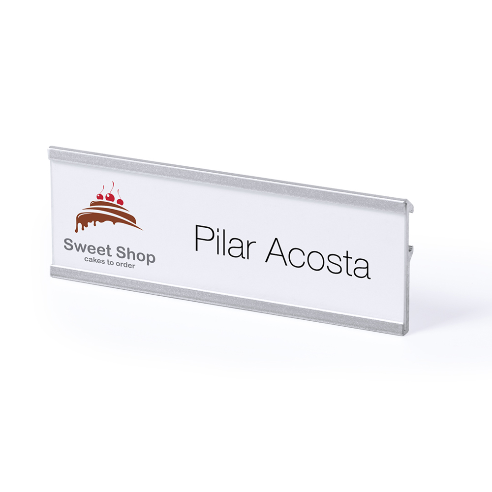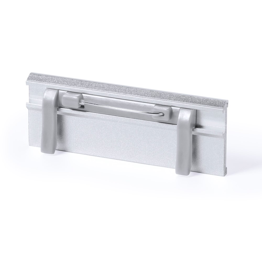 Ausweishalter mit Aluminiumrahmen in eloxierter Ausführung. Mit Sicherheitsnadel auf der Rückseite für sichere Befestigung.