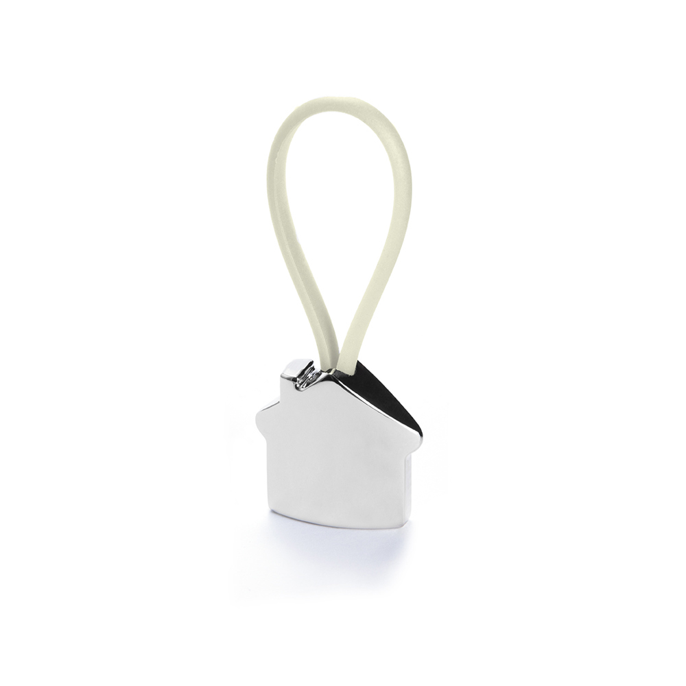 Metall-Schlüsselanhänger mit elegantem Haus-Design in 3D. Mit Gummiband in verschiedenen lebendigen Farben für die Befestigung der Schlüssel.