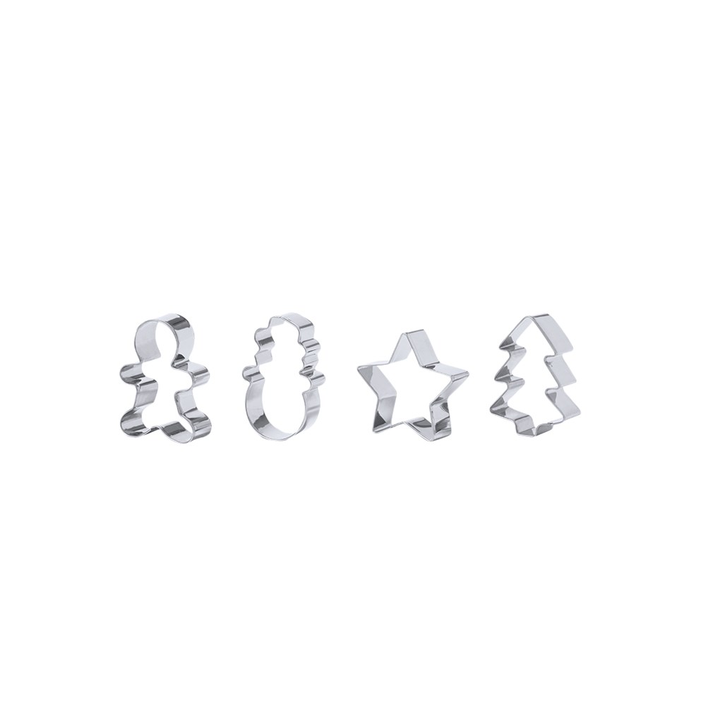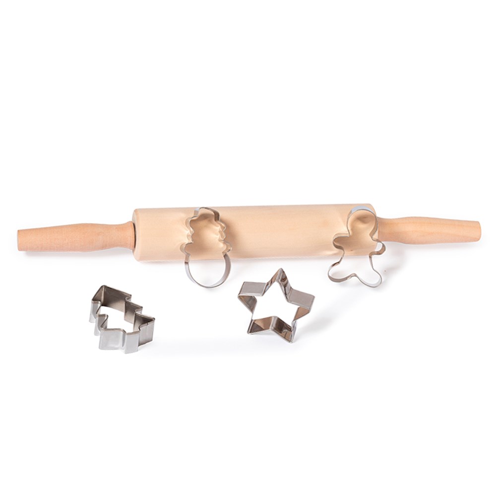 Backset mit Weihnachtsformen aus Edelstahl und Nudelholz aus robustem Naturholz. Enthält Nudelholz und 4 Formen in Form von Weihnachtsbaum, Stern, Schneemann und Lebkuchenmann. Präsentiert in einer Kraftbox.