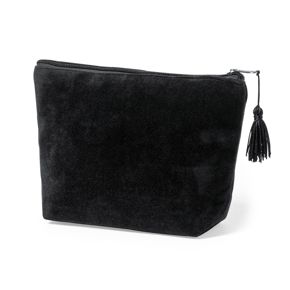 Kosmetiktasche aus Samt, mit Reißverschluss und Quaste am Griff. Hergestellt aus Rayonsamt und genäht, erhältlich in braun und schwarz.